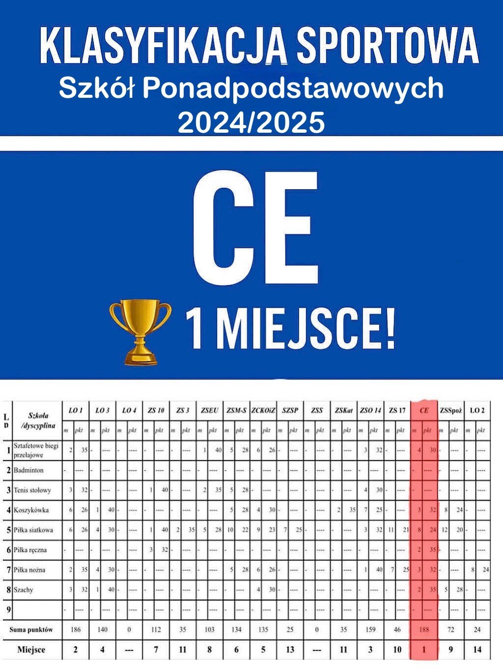 Z radością informujemy, że Centrum Edukacji zajęło I miejsce w międzyszkolnym współzawodnictwie szkół średnich w Zabrzu w roku szkolnym 2025/2026. To ogromny sukces, który jest efektem zaangażowania uczniów, nauczycieli i całej społeczności szkolnej. Gratulujemy wszystkim, którzy przyczynili się do tego osiągnięcia!