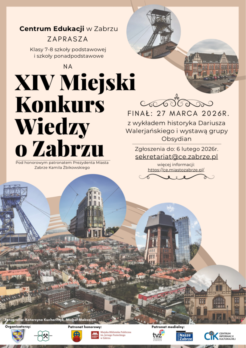 Serdecznie zapraszamy uczniów szkół podstawowych i ponadpodstawowych do udziału w XIV Miejskim Konkursie Wiedzy o Zabrzu.